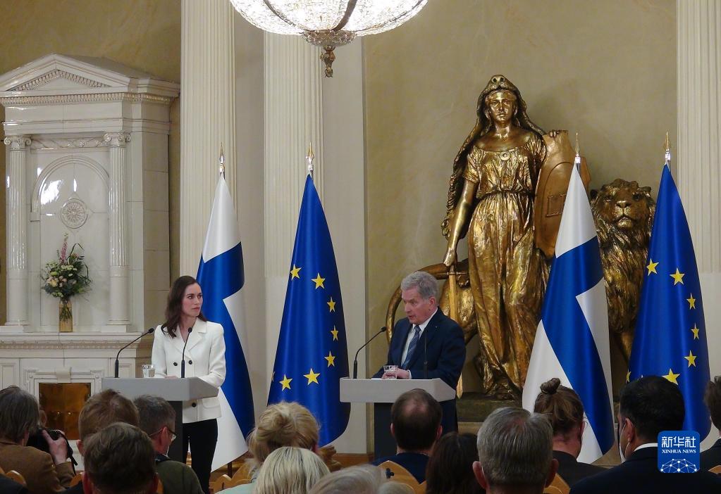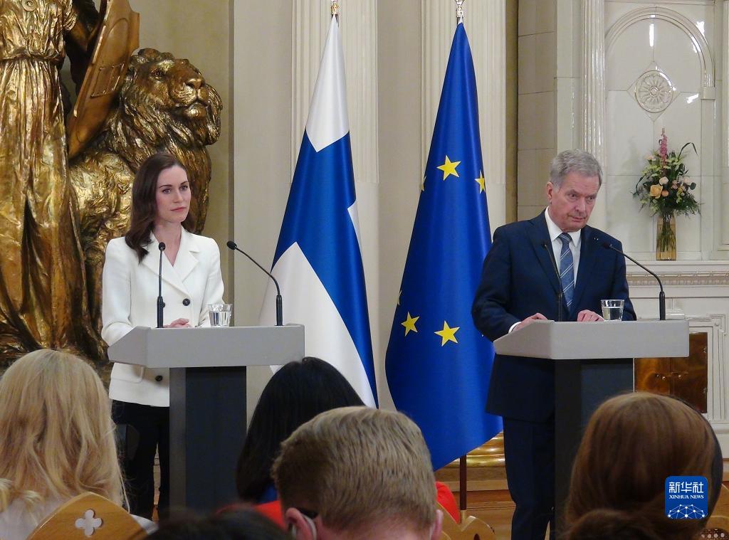 5月15日,在芬兰赫尔辛基,芬兰总统尼尼斯托(右)和总理马林参加联合记者会。新华社记者 陈静 摄