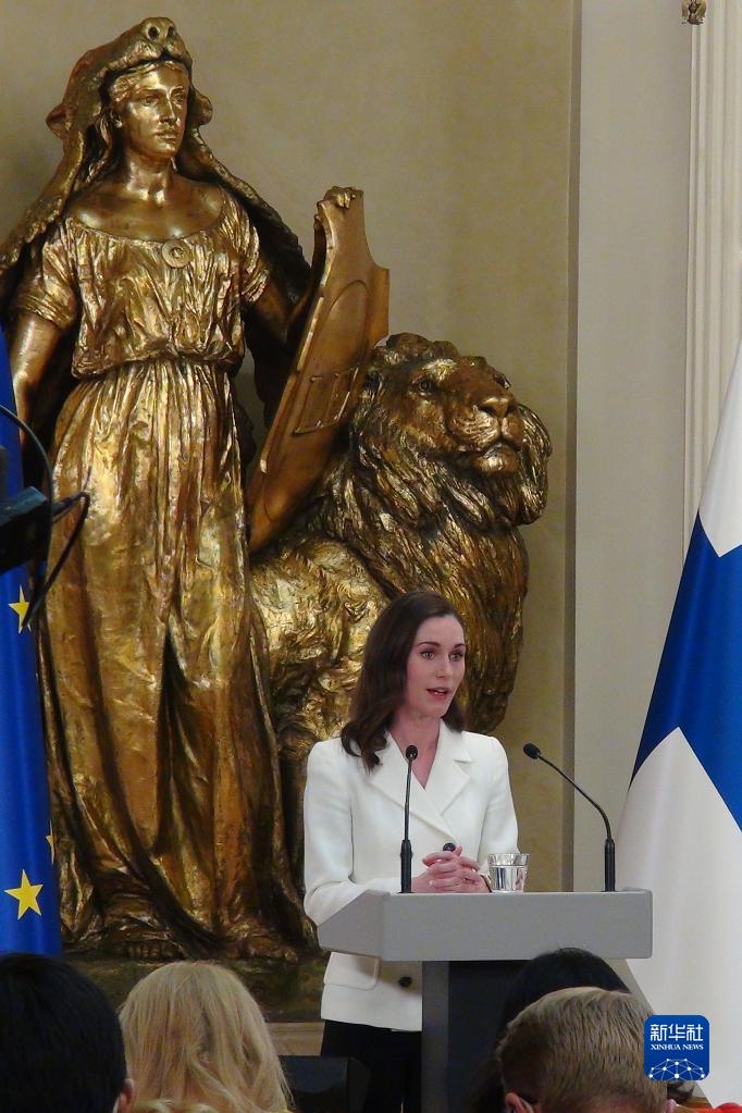 5月15日,在芬兰赫尔辛基,芬兰总理马林和总统尼尼斯托(未在画面中)参加联合记者会。新华社记者 陈静 摄