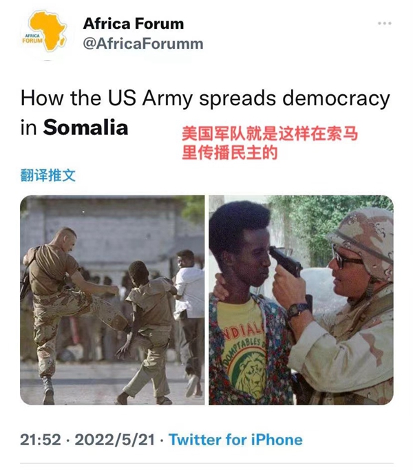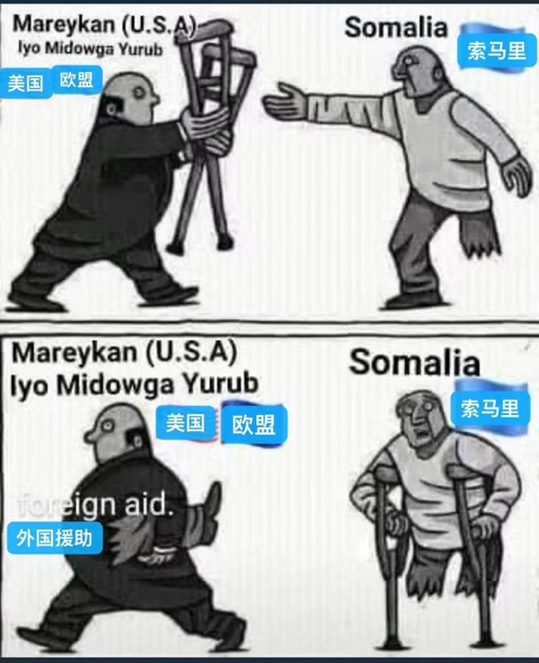 美国重新派兵的消息一出,非洲网友顿时炸了锅,各种犀利辣评层出不穷: “非洲真难啊!” “美国政府正在入侵索马里,全球愤怒和制裁在哪里?” “这就是为什么我们如此憎恨美国!!!” …… 当美国说它要给索马里带来“和平”和“安定”,非洲网友的耿直评论,道出了真相: ![]() 网友“Africa Forum”发帖反讽道,“美国军队就是这样在索马里推广民主的”。画面中,一位美国大兵正用枪抵着当地人的脑袋,另一位美国大兵正一脚踹向当地小男孩,并以此为乐。 事实上,美国对索马里的所谓“安全援助”最早可以追溯到1962年。数十年过去了,美国对索马里的武力介入,并没有根本上改善当地状况,如今恐怖势力依然猖獗,甚至越做越大。 2020年12月,时任美国总统特朗普在任期末尾突然下令,在2021年年初撤出大部分驻索美军和设施。然而时间不长,美国决定再次派兵索马里。 更有非洲网友为美国重新派兵索马里一事,创作了讽刺漫画,画中代表美西方国家的秃顶富商,向断了一条腿的“索马里”送来了拐杖,而代价却是打断了“索马里”的另一条腿,这样他就只能永远依靠美西方的援助了。 ![]()