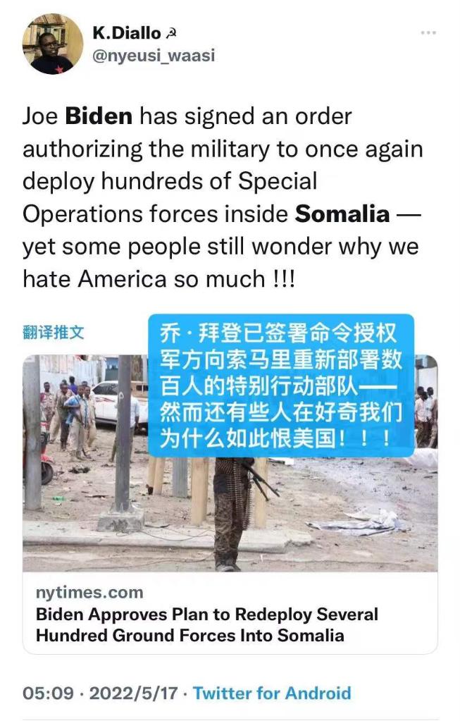 网友“K.Diallo”说:“乔·拜登已签署命令,授权军方重新在索马里部署数百名‘特别行动部队’——然而还有些人好奇为什么我们如此恨美国!!!”