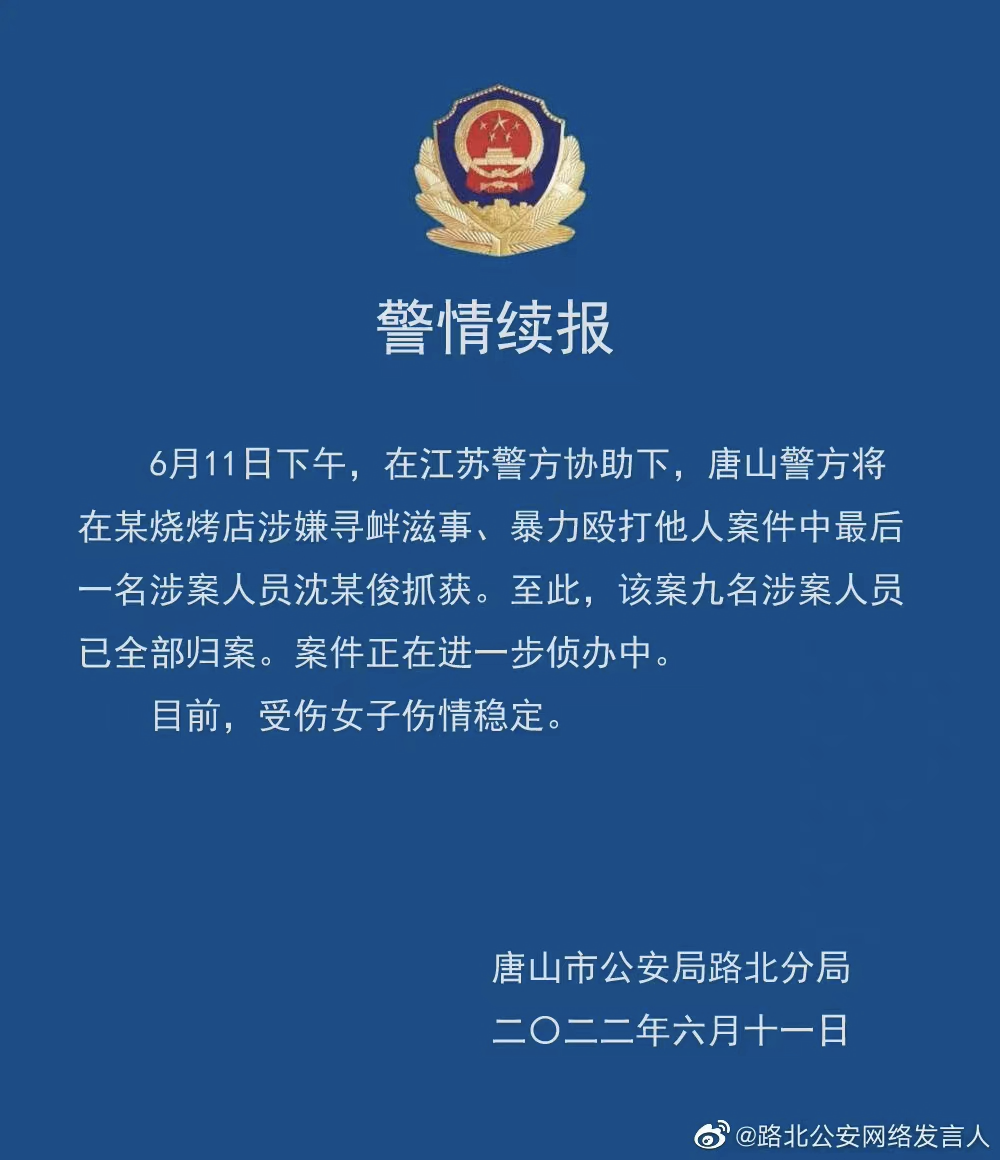 ![]() “地狱有什么可怕的?我带你看看人间。 人间有什么可怕的?我带你看看昨夜的唐山。” 6月10日,关于唐山烧烤店打人事件的恐怖视频,全网传播,阅读量很快超过了20亿。 人们震惊于:国家扫黑除恶多年,唐山的这帮狂徒,竟然如此无法无天,不知收敛。 人们更惊恐于:如果我们不反抗呐喊,那有朝一日,落在被打女孩身上的拳头和臭脚,也会成为我们每个人的噩梦。 至11日14时,9名涉案人员,全部抓获。 而这一次,我们所有女性,都不想听任何关于自保的建议。 因为,在胆大包天的罪恶面前,智慧只是讨巧,严惩才是良方。 这是怎样一起令人发指的案件呢? 因为视频过于血腥暴力,我用图文的形式和大家讲清楚。 这是一场,起于性骚扰的惨案。 6月10日凌晨2点多,唐山一烧烤店内。 受害人小萌(化名)和两个女性朋友,坐在店内门口餐桌上吃烧烤。 一个穿绿色衣服的男子(以下简称绿男)推门而入,该男子和一群哥们儿在店外吃烧烤。 绿男推门后,就赤裸裸地盯着小萌一个劲儿地看。 然后,绿男进到店内,和伙计交代了什么后,折身走向门口的途中,径直走向小萌,在她后背摸了一把。 小萌慌忙推开绿男的手。 绿男显然没有料到小萌反抗这么激烈,就再次上前摸小萌。 小萌再次迅猛推开了那只咸猪手。 绿男当场恼羞成怒,一巴掌扇到小萌的脸上。 小萌用双手推开绿男的殴打,绿男打得更猛了。 这时候,小萌同桌的女性朋友小橙(化名),赶紧站起来保护姐妹: 小萌被绿男性骚扰后果断反抗,小橙见姐妹受辱站出来说话,这都是良人本能。 谁,也没有资格说,小萌遇见性骚扰就活该忍受!小橙看见姐妹受辱就该沉默! 这是一场,girls help girls的营救。 小橙的劝架,更加激怒了绿男的暴戾。 他一拳将小橙打倒在地。 听到屋内的动静后,绿男的同伙——一个穿着黑衣的胖子(以下简称黑胖),从门外闻讯进来,拽着小橙的头发,拎起餐桌上的碗碟,向小橙头上砸去。 绿男的更多同伙,都从屋外进来,参与到殴打女孩们的罪行中。 刚才我们说,小萌同一个餐桌是3个女孩子。 见小橙被打,桌上的另一个女孩子,穿着灰色衣服的小曼(化名),赶紧上前,保护着小橙。 就在小曼保护小橙的瞬间,绿男穿白衣服的同伙(以下简称白胖),拎起一个凳子砸过来,结结实实地砸在用身体保护小橙的小曼身上。 白胖的凶狠,也激发了黑胖的暴戾。 黑胖上前,对抱着小橙的小曼又猛踹一脚。 然后,绿男又拽起在一旁吓得不知所措的小萌的头发,一路像老鹰抓小鸡一样,把她从店内往店外拖曳。 拖曳的过程中,绿男、黑胖和白胖,用啤酒瓶、用脚对着小萌的头部,一阵暴击暴踩。 剧痛感,从屏幕内溢出来,让人不忍直视,又倍感揪心。 打红了眼的这群畜生,仿佛打的不是一个女生、一条生命,而是随意处置的物件。 小萌被拖到门外后,店外一个穿白衣服的好心女孩,着急地劝阻“不要打了,不要打了”。 结果,绿男转身一猛拳,把这个好心女孩一拳击倒在地。 女孩的头重重地砸在台阶上。 ![]() 无辜的女孩,莫名被性骚扰,愤怒反抗,却遭到殴打。 姐姐妹妹们都站起来,谴责人渣,人渣的同伙加入其中,对姑娘们群殴。 Girls help girls,勇敢团结,又疼痛悲壮。 渣男帮助渣男,不问是非,暴戾残忍,无法无天。 这是一场,对女性恶意满满的罪行。 被拖到店外后,因反抗性骚扰而被暴打的小萌,又被这群畜生殴打数分钟。 绿男先后两次,要拿起酒瓶子砸小萌的头部,被旁人拦下后,他就用脚猛踹小萌的脸部。 猛踹之后,绿男又拖曳小萌四五米,继续拳打脚踢。 然后,不顾众人劝阻,再次拿起啤酒瓶,猛砸小萌的头部。 虽然,现场时不时传来“不要打了,不要打了”的制止声,但绿男就像被恶魔附身了一样,在三四分钟内一直拽着小萌的头发,踢她的脸,砸她的头,猛踹她的身子。 直到最后,被人强行拉走,绿男还在骂骂咧咧地恐吓。 案发现场有两个细节:一个是,绿男这帮人,打红了眼后,连和自己一同吃饭的女生,都打了几拳。 但他们没有敢对现场任何一个男人动手。 这种无差别对女性的攻击,暴露了这帮欺软怕硬的畜生,对女性伤害的理所当然,还有骨子里的厌女症。 另一个是,有个在现场吃饭的女孩,目睹现场残忍的暴行后,吓得躲到男朋友的怀里。 但看到绿男一帮人要把小萌打死时,她挣脱男朋友的怀抱,要去帮小萌,但被男友果断拽回来后,强行拉走。 这个镜头,让人看得五味杂陈: 理解女孩男友的自保,但更为现场每个挺身而出的姑娘动容。 谢谢你们,没有对暴力和罪恶熟视无睹。 谢谢你们,让我们看见“她力量”的互助和善良。 这是一场,不该忘却的舆情。 唐山烧烤店打人事件的视频曝光后,全网在头皮发麻的围观中,气得肝疼: 女人们为遭遇暴力的女孩,恸哭。 男人们为那群非我族类的同性,感到羞耻。 “严查!严惩!严打!不要放过这群畜生!” 成了善良者共同的呼声。 全网关注下,唐山警方昨天深夜和今天下午发布通报,称已经锁定嫌疑人,并已全部抓获,共9名。 暴戾不能纵容,恶行无法直视。 更令人悲伤的是,是有人拿着放大镜,去审判受害者女性。 这一次,我们再也不想听: 女孩深夜不要出来,被骚扰就要学会忍耐,遇见危险马上就跑……诸如此类的说教。 因为,今天这起事件,根本就不是女孩子要如何保护自己的问题,而是这个社会要如何尊重并保护女性的问题。 “你们说,女生不要一个人出门,她们是结伴而行。 你们说,女生不要去偏僻的地方