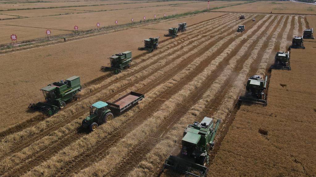 当日上午,新华镇十万亩高产高效粮食生产示范园区内机声隆隆、麦浪涌动,15台大型联合收割机呈“雁阵”排开,有序进行收割小麦作业。“今年我种了300亩小麦,麦穗比较大,颗粒很饱满,预计每亩产1000斤左右,肯定是粮食大丰收。”种粮大户薛志强说。