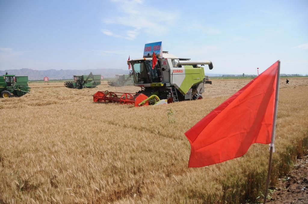 临河区新华镇十万亩高产高效粮食生产示范园区小麦开镰。新华社记者 李云平摄