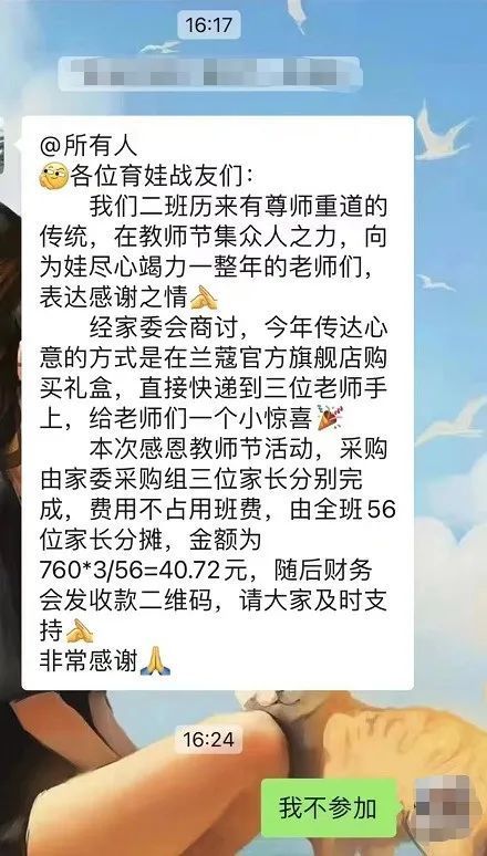 群聊中,一名家长“振臂一呼”,说班里有尊师重道传统,佳节来临之际,家委会决定向辛苦一整年的老师们表达感谢。今年“传达心意的方式”,是在化妆品网店购买礼盒,直接快递到3位老师手上,费用由全班56名家长平摊,每个人得交40多元。 某位家长直接回怼:“我不参加!”群内瞬间炸锅,其他人纷纷要求不配合的家长退群。 看到这一幕,网友们忍不住吐槽。 有人说,孩子刚上幼儿园,家委会就筹备“教师节特别活动”,开口就要1800元,简直是“天大的排场”;有人爆料,集资送礼不算啥,最可气的是家委会花钱不透明,自己质疑统一购买的书目有问题,立马就被反呛:“你问书长什么样就有问题!”看来柳州家委会的事还真不是个例。 说起给老师送礼,岛妹读书那会儿,学生即便送,也无外乎是自己做的手工、贺卡,礼轻情重,以谢师恩,偶尔送盒巧克力,还被老师拒绝。老师说的话,到现在岛妹都记得:你们又不挣钱,花的还不是家里的?尊师重道在心里,不在礼品礼金、虚荣攀比。 按教育部规定,家委会的职责是“参与学校管理和教育工作,沟通学校与家庭”,但近年来,家委会变味的新闻屡见网络。 比如,最近内蒙古某校家委会“集资整修教室”,要求每名家长交300元,累计违规收取资金1.2万余元;为加入家委会,上海某小学家长们各显神通,美国名校学历、知名外企高管仅是“及格线”;北京某家长连续几天到校“加班搞卫生”,就因班主任念叨了一句“家委会应帮忙改善教室面貌”…… ![]()