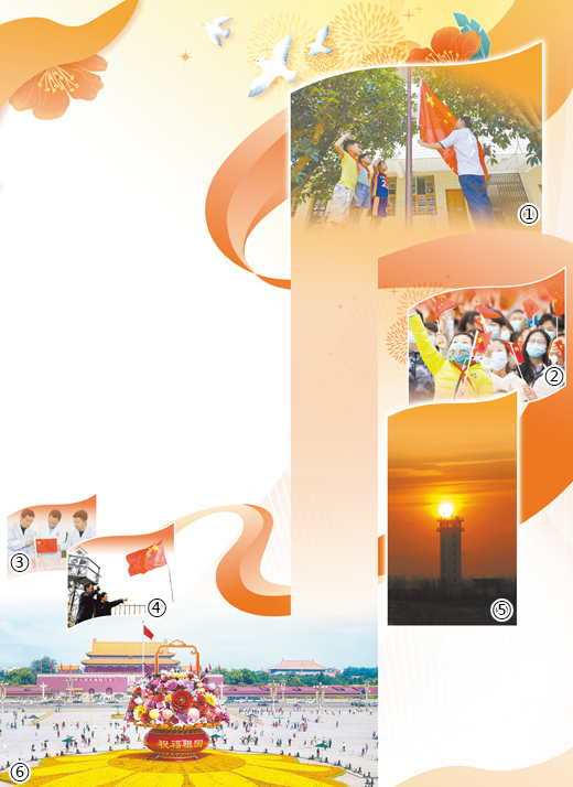 图②:清晨,伴随着雄壮的国歌,来自全国各地的群众齐聚北京天安门广场,见证五星红旗冉冉升起的庄严时刻。 新华社记者 陈钟昊摄(资料图片) 图③:嫦娥五号月面国旗展示系统研制团队在探讨技术细节。 中国航天科工集团供图 图④:清晨,在河北塞罕坝机械林场,赵福州、陈秀玲夫妇在天桥梁望海楼升起一面崭新的五星红旗。 陈琦佳摄(人民视觉) 图⑤:黑龙江黑瞎子岛东极哨所高高的哨楼,像永不熄灭的火炬般耸立在祖国边关。 杜迎春 肖方敏摄影报道 图⑥:国庆节临近,“祝福祖国”巨型花果篮正式亮相北京天安门广场。该花果篮顶高18米,篮内选用了10种花卉和10种水果,象征十全十美,体现花团锦簇、硕果累累喜迎二十大的美好寓意。 本报记者 贺 勇摄 北京天安门广场 9月27日的清晨,北京天安门广场装扮一新。6时许,在天安门广场上,升国旗号角吹响,国旗护卫队列队护旗而出。“向国旗——敬礼!”伴随着雄壮的《义勇军进行曲》,在群众的注视下,五星红旗冉冉升起。 熙熙攘攘的观礼人群中,一位脖子上挂着相机的老人显得很特别。“我可能是全国观看天安门升旗仪式最多的人之一。”老人名叫高源,退休前曾在天安门广场的照相服务点为南来北往的游客拍了40多年的照片。“每一次参加升旗仪式,感觉都不一样,脑海里像放映电影一般感受着祖国的日新月异。” 升旗仪式结束后,观礼群众久久不愿散去。仰望国旗,人们不禁思绪万千——70多年前,毛主席在天安门城楼上庄严宣告新中国的成立;今天,阔步在复兴新征程上的中华民族,迎来了从站起来、富起来到强起来的伟大飞跃。 国歌悠扬的旋律,比风传得更远。一个个日夜坚守的身影,在国旗飘扬的庄严中,渐渐重叠,又分外清晰。 “革命烈士的鲜血染成了这红色,中间的大五角星是党,我们像边上的小五角星一样围绕在党的周围。”在广西南宁市上林县西燕镇中心学校刁望教学点,每到国庆,石兰松一定会向学生们科普五星红旗的象征意义。1985年,石兰松受恩师病重时的嘱托,成为教学点的代课教师。37年来,石兰松已数不清自己教过多少学生,只知道有许多学生考上了大学,还有学生做了人民教师。无独有偶,在广西柳州市融水苗族自治县和睦镇沙巩村教学点,全科老师陈记源在这里坚守30余年。“哪怕教学点只剩一个学生,我也会坚持下去。” 陈记源说。 日头晒过几度春秋,刁望教学点与沙巩村教学点的国旗也总在换新。“每个学期都要换一面国旗,国旗不能用太旧的。”石兰松说。言传身教,老师们对国旗的尊重与热爱也在影响着跟前的娃娃们。 黑龙江黑瞎子岛 临近国庆的清晨,第一缕阳光洒落在祖国东极,将黑龙江抚远市黑瞎子岛染上瑰丽的金黄,驻守在这里的北部战区陆军某边防旅东极哨所,矗立于“金鸡尖喙”上。晨光中,战士们高举的国旗更显鲜艳。“向国旗——敬礼!”5时许,一声号令,50多名战士齐刷刷抬臂敬礼,飞扬的五星红旗向上、再向上…… 守岛10年间,老兵张国超无数次注视着国旗冉冉升起,鲜艳的旗帜也见证着战士们日复一日的守望。 张国超记得,最初岛上生活条件艰苦。“放眼望去,不是草,就是雪。但即便当时条件简陋,鲜艳的五星红旗始终飘扬。”2013年,面对百年一遇的洪灾,张国超和战友们绑在一起,蹚着过膝洪水,艰难摸上国旗台,在断水断电的一个月里,坚持每天都把国旗高高升起。 对国旗的格外珍爱、对祖国的由衷热爱,是流淌在我们血液中的一种情感,是滋养我们精神的一种养分。一面面五星红旗高高飘扬,讲述着一个个平凡人忠诚、坚守与传承的故事,诉说着他们对祖国最赤诚的心声、最深情的祝福。 河北塞罕坝机械林场 清晨5时50分,在河北塞罕坝机械林场的最南端,天桥梁望海楼的楼顶处,火情瞭望员赵福州、陈秀玲夫妇迎着初升的太阳,拿出一面崭新的五星红旗,细心地系在锃亮的不锈钢旗杆上,固定在楼顶围栏旁自制的插座上。幽静的百万亩林海之间,五星红旗在海拔1700米的高原上高展如火炬、鲜红如朝霞。 1983年,赵福州接过父亲手中的接力棒,带着爱人陈秀玲一起来到天桥梁望海楼驻守。守护林海近40年,在这里升起国旗一直是赵福州的心愿。起初,他用木头做了一根简易旗杆。可是坝上风大,木杆极易被吹倒。“要是连国旗都守不住,还怎么能守护好这片林海呢?”2013年国庆节前夕,恰逢装修工人来装修望海楼的楼顶围栏,赵福州便请工人做了一根不锈钢旗杆。2013年国庆节当天,当鲜艳的国旗飘扬在林海上空,赵福州的内心久久不能平静。站在国旗下,他更真切地领会到守护这片林场的含义,更深刻地意识到自己身上的责任。 西藏詹娘舍哨所 8时许,海拔4600多米高的西藏军区某边防团詹娘舍哨所也迎来了晨曦的霞光,驻扎边防一线的战士们正在准备升旗仪式。这座位于喜马拉雅山脉南麓的“云中哨所”,四周全是85度斜坡的崖壁。每次升旗,战士们都要沿着山脊线,跳过峭壁,来到一个不足6平方米的悬崖平台上。日复一日,当太阳升起时,鲜艳的五星红旗就会在这片雪域高原上猎猎飘扬。 嫦娥五号着陆器 注视着那抹“中国红”,目光也随之投向更高更远的深空。“月面上的五星红旗!”——两年前那激动人心的画面仿佛再度跃入眼帘。2020年12月3日,嫦娥五号着陆器和上升器组合体在月面工作期间,实现了月面国旗展开,这是我国在月球表面首次实现国旗的“独