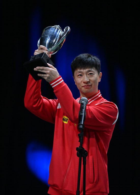 5月28日,马龙展示复刻圣·勃莱德杯。新华社记者 陶希夷 摄