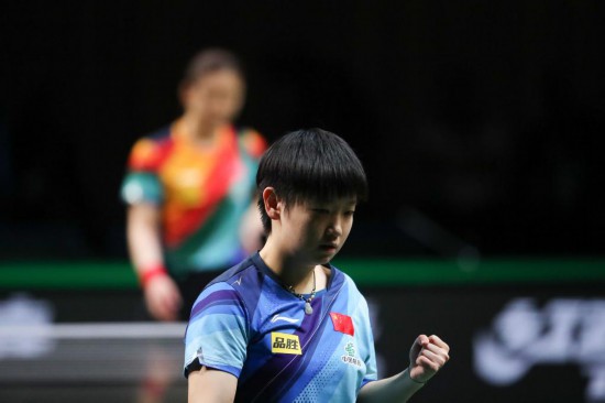 5月28日,孙颖莎在比赛中庆祝得分。新华社记者 韩旭 摄