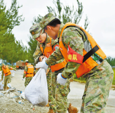 8月6日,陆军第78集团军某旅官兵在黑龙江省五常市沙河子镇抢修道路。 王麒淞摄、