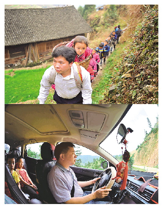 ▲上图:在广西龙胜龙脊镇江柳村,江柳村翁江小学唯一的老师在放学路上将一个走不动了的孩子背在背篓里,领着其他孩子一起回家(2013年2月26日摄);下图:余启贵开着自己的汽车带着学生去学校(2020年7月7日摄)。新华社记者陆波岸摄