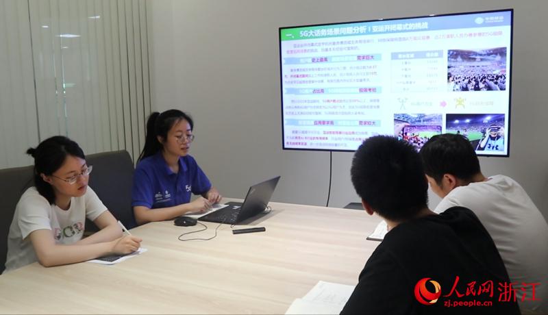杭州亚运村运行团队餐饮服务中心副主任胡传刚(右一)和团队进行工作复盘。人民网 秦铭泽摄
