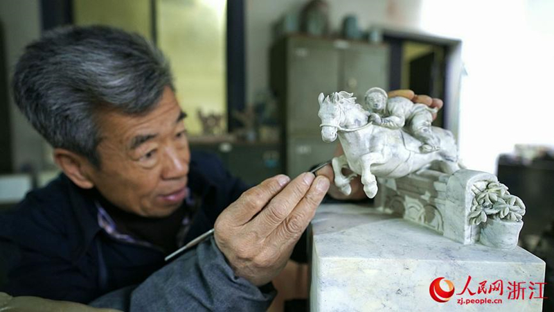国家非遗传承人钱高潮创作的亚运主题石雕。人民网记者 郭扬摄