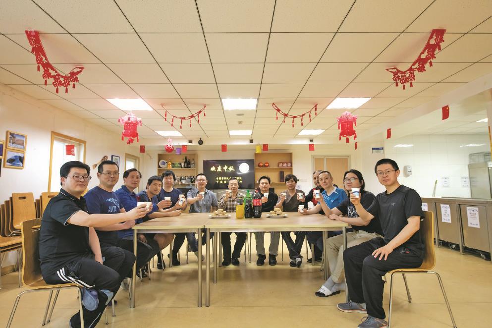 杨卫廷(右一)与科考队员们将在位于东南极大陆的中国南极中山站度过一个别样中秋。(受访者供图)