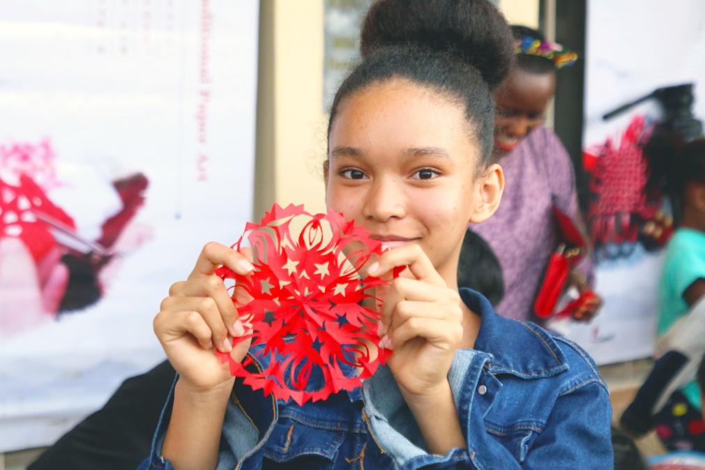 9月23日,卢旺达首都基加利,在卢旺达大学孔子学院举办的“中国文化进校园”暨中秋国庆庆祝活动现场,一名女孩展示剪纸成果。(新华社发,黄万晴摄)