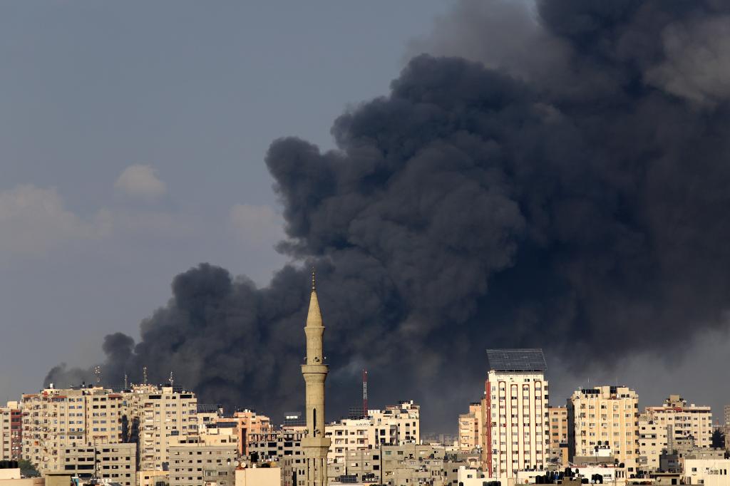 10月11日,加沙城的建筑遭以色列空袭后升起浓烟。 新华社发(里泽克·阿卜杜勒贾瓦德摄)