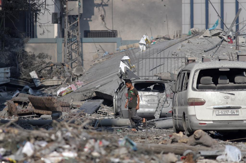 10月11日,在加沙城,一名男孩走过以色列空袭炸毁的建筑废墟。 新华社发(里泽克·阿卜杜勒贾瓦德摄)