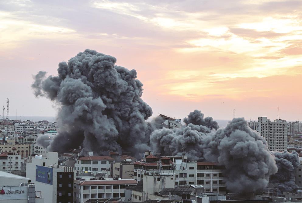 10月7日,加沙城,以色列军队空袭地面建筑造成浓烟滚滚。 新华社发