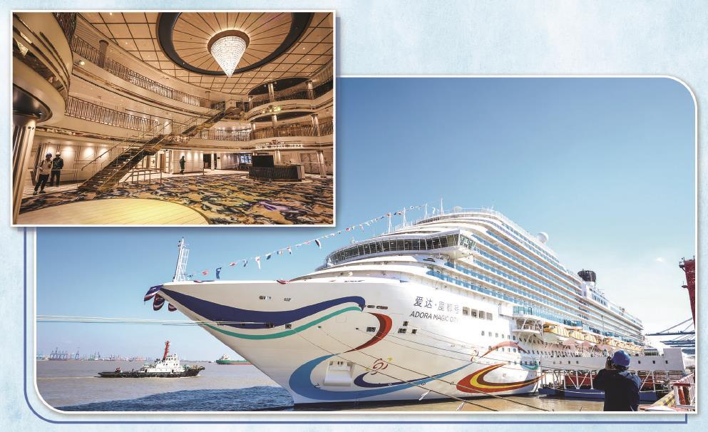 我国首艘国产大型邮轮“爱达·魔都号”昨天在上海正式命名交付。 均文汇报记者 袁婧摄 制图:张继