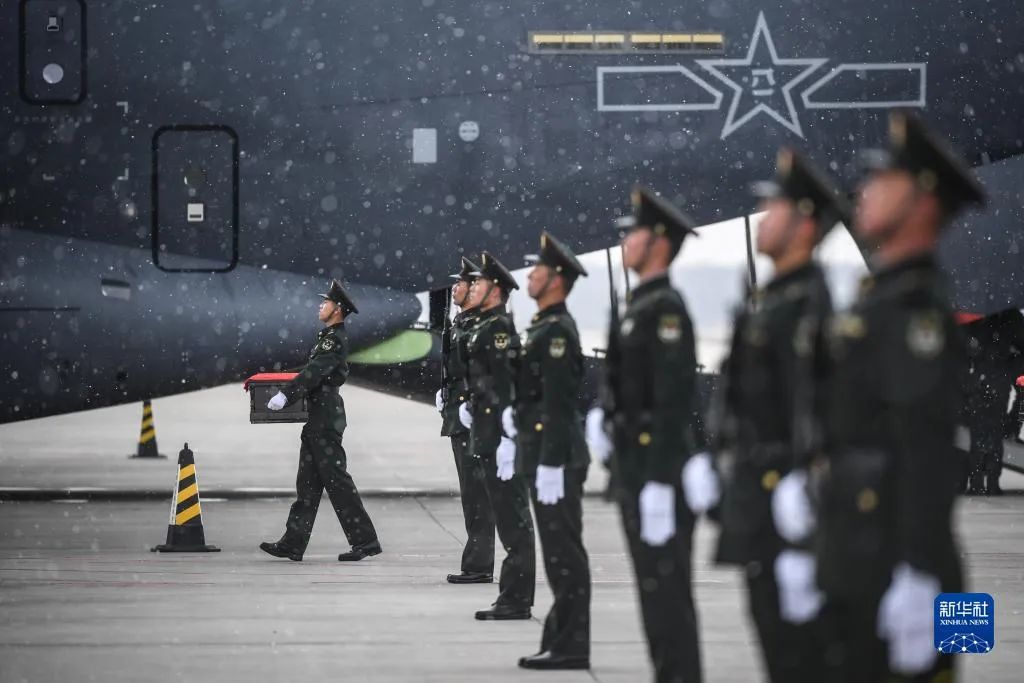 当搭载志愿军烈士遗骸的专机进入中国领空,机长路中华对着话筒开始舱内广播:今天,回到家了,让英雄们好好看看我们美丽而和平的祖国! 机舱尾部悬挂着横幅“我们接您回家”。 专机降落后,两架护航的歼-20战斗机以超低空通场飞行的方式,向英烈们致以最崇高的敬意。停机坪上庄严肃穆,50多名礼兵和持枪卫兵挺拔肃立,专机缓缓穿过代表着最高礼遇的“水门”,稳稳地停在停机坪上。 12时10分许,礼兵手捧烈士棺椁缓缓走下专机。这一刻,英雄们的灵柩终于踏上了祖国的土地。 “抬棺椁!”伴着军号手吹响婉转低回的《思念曲》,礼兵护送着25位志愿军烈士的灵柩,轻轻地摆放到军车上。仪式结束后,在45辆警用摩托车的护送下,车队送归国的英雄前往30公里外的沈阳抗美援朝烈士陵园。 当天,沈阳气温骤降,天空飘起了雪花。众多市民冒着严寒,站立在道路两旁,静静地等候着车队的到来。 北部战区陆军某旅战士蒋健元今年首次承担引导车队行进的任务。“看着道路两旁手持国旗等待的人群,我激动得热泪盈眶。”他说,这一刻,自己深深理解了,为什么志愿军战士被称为“最可爱的人”。 沈阳抗美援朝烈士陵园的下沉式纪念广场中央,寓意英雄如山、祈愿和平的主题雕塑静静矗立;长逾百米的英名墙上,镌刻着19万多个抗美援朝烈士的英名。 24日上午,这25位志愿军烈士遗骸将在此安葬。 ![]()