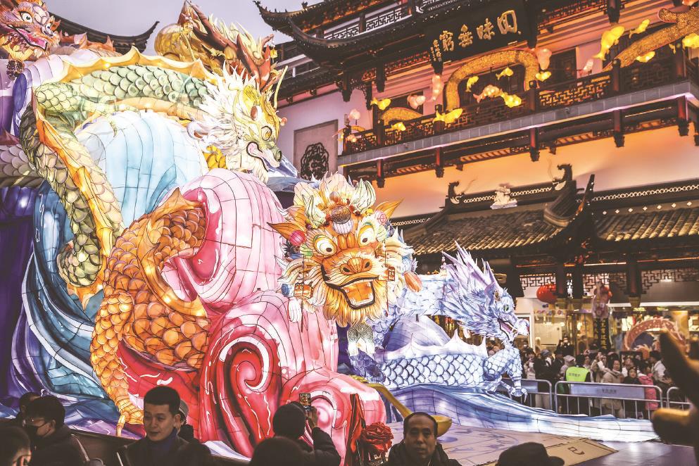灯火可亲,山海可忆。伴随着千灯启明,2024豫园民俗艺术灯会昨天启幕。今年豫园灯会依然以《山海经》作为蓝本,将续写“山海奇豫记”,开讲“海经篇”。四个门头、五大场景打造出深海与河图之象,呈现生肖龙与海洋动植物交织的奇境。在接下来持续40天的奇幻旅程中,引领游客在浓浓年味中揭开星辰大海的神秘面纱。 作为国家级非物质文化遗产,第29次璀璨绽放的豫园灯会,今年首次走出国门。就在上海豫园灯会启幕的同时,法国巴黎与中国上海同日闪亮华灯,中法灯会梦幻联动,同时上演主题文化演绎,共同喜迎2024年新春。 豫园灯会开启“海经篇”,走进灯火奇幻之境 鱼群摇曳、浪卷云舒,徜徉亭台楼阁间,宛若遨游在海错翩然、星汉灿烂绮梦幻境之中……千灯启明之际,豫园仿佛一夜“造梦”。不少游客留下感言:“像走进了灯火奇幻之境”“绝美现实版大鱼海棠”…… 豫园的四个门头,被巨大的“神龙神将”包裹,作为引领游客穿越海底,进入奇幻仙境的序章。据介绍,这四个门头都饱含美好寓意,带给大家好运连年:赤龙遂愿、鸿运当头;水天龙影,一帆风顺;金龙启运,龙舞祥瑞;苍龙祈福,乘风破浪。从四个门头进入,可抵达不同的奇幻仙境。记者在现场看到,除了已提前亮相的凝晖路“一夜鱼龙舞”外,其他主灯组也一一揭开面纱。 进入黄金广场,仿佛进入奇幻瑰丽的深海仙境乐园,可步入的沉浸式场景让人有镜花水月的飘渺空灵感。蓬莱仙山倒立悬置,珠玕之树屹立中央,树枝如同五彩斑斓的珊瑚般绽放,树上挂着形如珠玉的神奇果实。“蓬莱三仙”福鱼、禄鱼、寿鱼跳脱灵动。相关负责人介绍,游客穿行其中,宛如龙形游走,意为“藏龙”,不仅如此,与珠玕之树遥遥相望的黄金树,往年便是祈愿纳福之地,今年市民游客还可领取福牌,写下新年心愿。 中心广场依然是生肖主场。一条巨型黄龙以“飞龙跃海”之姿,环抱一颗被海浪托起的蔚蓝之球。浪花翻涌间,形态各异的华夏之龙飞跃共舞。抬头四顾,华宝楼上,龙身游走,仿佛携江水而来汇聚于此。巨大的司南浮于海面之上,拨动司南,斗转星移。 九曲桥头是每年豫园灯会的重头戏,鱼龙公主摇曳生姿,引领人们进入“海错翩然、星汉灿烂”的深海世界。潜龙鲨带领体态婀娜的海错小伙伴,欢快地向龙马的方向游去,与石珊瑚和贝母珍珠,组成一幅珠光宝气、吉祥璀璨的萌趣场景。走到九曲桥中心,英姿飒爽的龙马公子带领鱼龙们出水飞天,光影中闪现“河图之象”,水花飞溅化作满天繁星,汇成星辰大海。龙马周身,跳鱼在海葵间腾跃,蚝鱼欲吹开牡蛎大快朵颐,钱串鱼吐出一串串金币,飞鱼以飞跃之姿蓄势越过“龙门”。九曲桥尾端,银光闪烁的灵龙,时而盘旋于云海之巅,忽又飘忽直下破空而来。 设计难度“有史以来最大”,迎接挑战超越自我 一夜之间,千灯竞放。大大小小共计100多组灯、3000多个单体灯,共筑豫园灯会的奇幻之境,也创新演绎出中国传统文化的大美之韵。 “早在去年豫园灯会结束不久,今年的‘海经篇’策划就已经开始了。”大豫园商业发展集团豫园一期文化品牌部副总经理尹歌告诉记者,从创意激荡到跃然纸上,再到华彩启幕,前后跨度长达一年。去年4月记者在采访“仲春花朝节”之际,就已经看到设计团队在反复打磨龙的灯组造型,尹歌说,去年“山海奇豫记”豫园灯会火爆出圈,放在团队面前最大的挑战,是如何超越自己。也正因此,今年豫园灯会“海经篇”在难度设计上可谓“有史以来最大”。 “有史以来最大”难度,也为后期的设计落地和灯组悬挂带来极大挑战。以凝晖路上的“一夜鱼龙舞”为例,要在狭小的空间里用400多条鱼组成“鱼化龙”的巨大灯组,相比过去的彩灯布置难度大大提升。一位“点灯人”告诉记者,所有的彩灯布置都要在深夜游客散去之后,就为了一个灯组,他们连续两周在深夜赶工,上千次起降、百余根钢丝铺设、近2吨重量承托、54米灯组搭建,数十位点灯人黑夜中坚守匠心、默默付出,才有了“鱼群汇聚成游龙回旋之姿”的状态,将辛弃疾《青玉案·元夕》中所描绘的元夕灯会繁华之景带到当下。 灯光的创新也是今年豫园灯会的亮点之一。记者在九曲桥边看到,桥头的鱼龙公主十分亮眼,如果仔细观察,会发现它的尾巴并非传统的正红色,而是有层次感地显示出从红到蓝、从白到紫的流光效果,在夜间如霓裳轻舞。“九曲桥上的这组灯光是这几天才调试完成的。”尹歌介绍,这一灯光组的难度不仅在于需要工人在寒夜下水安装,而且还要悉心调节色温和饱和度,“别看这些细微的颜色差别,每一个色温都要在现场反复调试多次,以达到流光溢彩的整体效果。”而这样的流光效果,在今年的豫园灯会多处都能看到。 沉浸式游园与元宇宙交互,让人与景相互映衬 随着豫园灯会的司南转动、灯组闪耀,豫园的文化配套活动也同步登场,通过沉浸式演绎和科技人文互动,让人与景在宏大的主题下相互映衬。 造景美陈本身,就是沉浸式演绎的舞台。《舞春灯》中江南女子婀娜婉约,与手中花灯交相呼应;《龙云赋》融合了中国舞的慷慨与灵动;《滚灯舞》展现非遗技艺和文化传承;《双龙汇》则结合舞蹈和武术的力量。非遗文化巡游也将安排上,《板凳龙》起伏穿梭中,象征龙年祥瑞;《鳌鱼戏》在游走间鱼龙嬉戏,映射着每一个人拼搏奋斗的身影。 元宇宙交互表达也成为文化IP