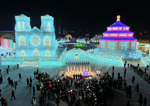 1月5日,夜幕降临,第25届哈尔滨冰雪大世界中的巨型冰雕景观“北京天坛”和“巴黎圣母院”色彩斑斓、熠熠闪光,吸引众多游客“打卡”。(新华社)