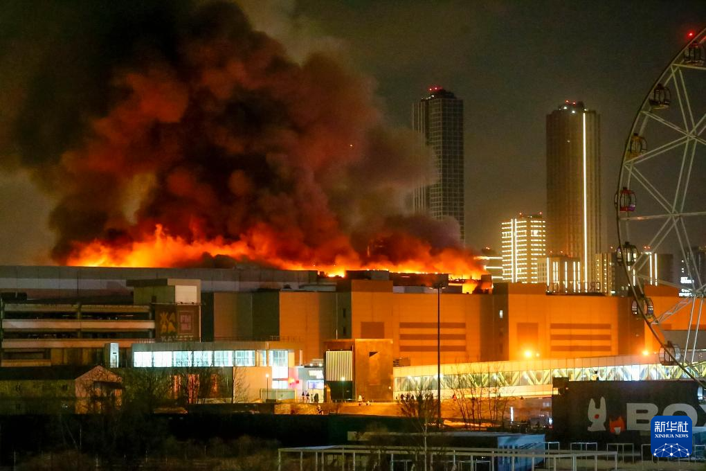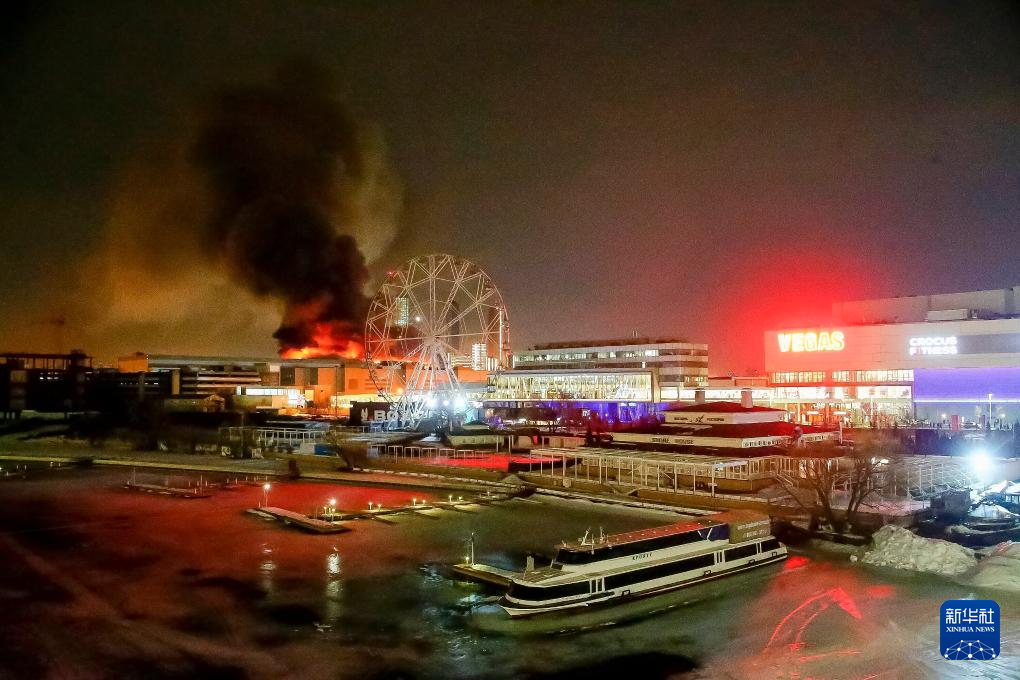 这是3月22日在俄罗斯莫斯科近郊克拉斯诺戈尔斯克市拍摄的火光中的“克罗库斯城”音乐厅。新华社/美联