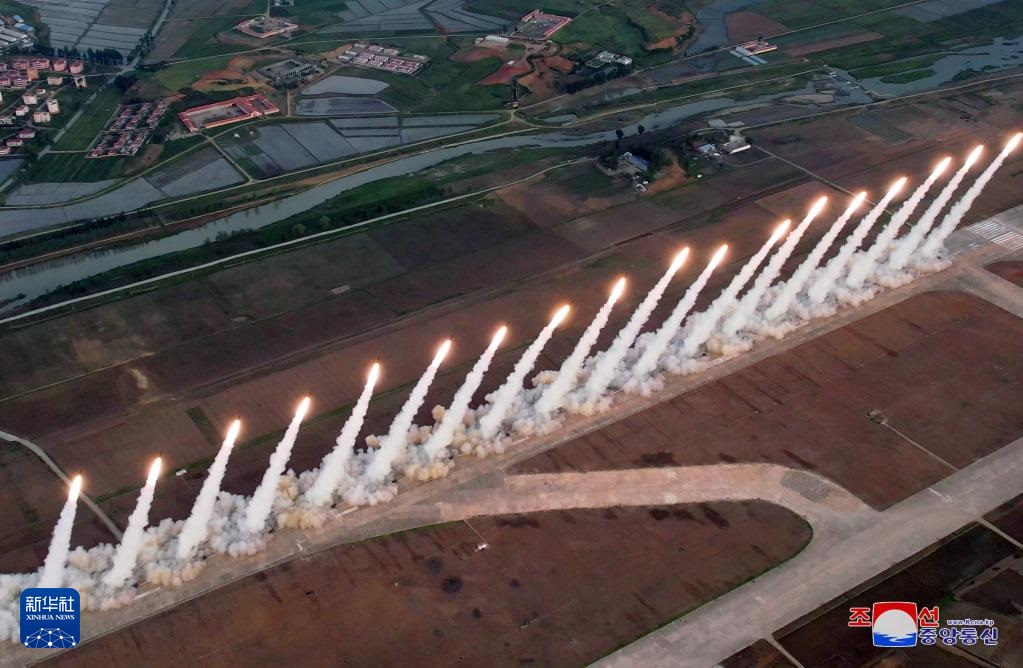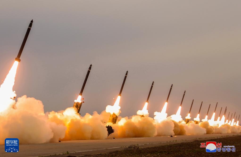 这张朝中社5月31日提供的照片显示的是火箭炮火力示威射击现场画面。新华社/朝中社