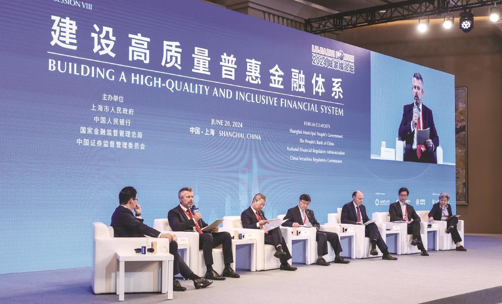 2024陆家嘴论坛设有8场全体大会,汇集中外专家学者代表,议题涵盖当前经济、金融领域的热点问题。 “全体大会八:建设高质量普惠金融体系”现场。