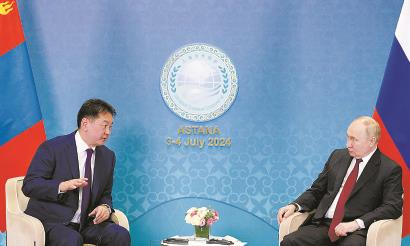 7月3日,在哈萨克斯坦阿斯塔纳举行的上合组织峰会期间,普京会见呼日勒苏赫。 视觉中国