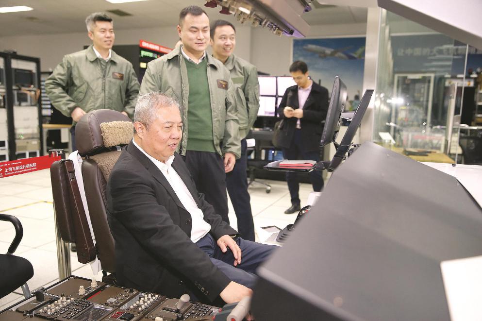 吴光辉(坐者)驾驶模拟机完成C919飞行试验。 (均受访者供图)