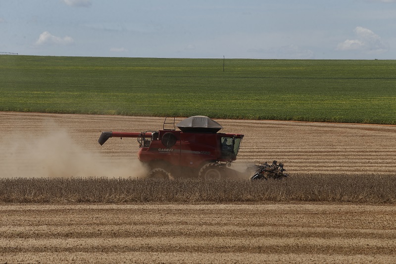 在巴西巴西利亚附近的纳蒂瓦农场,农民驾驶农机收割大豆。(新华社发)