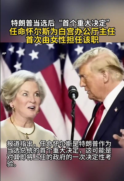![]() 据美联社11月7日报道,美国当选总统唐纳德·特朗普任命主导了其竞选胜利的事实上的竞选经理苏茜·怀尔斯为白宫办公厅主任。怀尔斯是第一位担任这一重要职位的女性。 报道称,在特朗普核心圈子内外,怀尔斯都被广泛认为领导了迄今为止特朗普最有纪律、执行力最强的竞选活动,并被视为该职位的最有力竞争者。竞选期间,她在很多时候都避免出现在聚光灯下,甚至在特朗普6日凌晨庆祝胜利时也拒绝发言。她拒绝接受“竞选经理”的正式头衔,以避免成为众矢之的,因为特朗普过去曾频繁更换这一角色。 报道指出,任命怀尔斯是特朗普作为当选总统的首个重大决定,这可能是对其即将上任的政府的一次决定性考验,因为他必须迅速组建一个团队来协助管理庞大的联邦政府。怀尔斯没有太多联邦政府工作经验,但她与当选总统关系密切。 ![]()