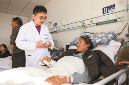 上海第十批援藏医疗队队员、上海市胸科医院胸外科主治医师冯键与巴桑顿珠交谈术后康复事项。目前,上海市第十批医疗人才“组团式”援藏工作队24名队员,依旧在日喀则市参与救治工作。均本报特派记者 赖鑫琳 摄影报道
