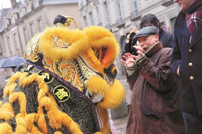 法国雷恩,舞狮表演者与当地民众互动。 均 新华社发