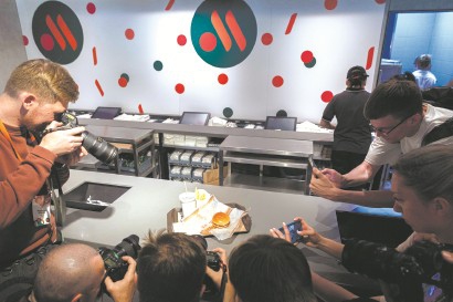 在俄罗斯首都莫斯科普希金广场的“只有美味”连锁餐厅,媒体记者拍摄制作完成的套餐。 新华社发(资料照片)