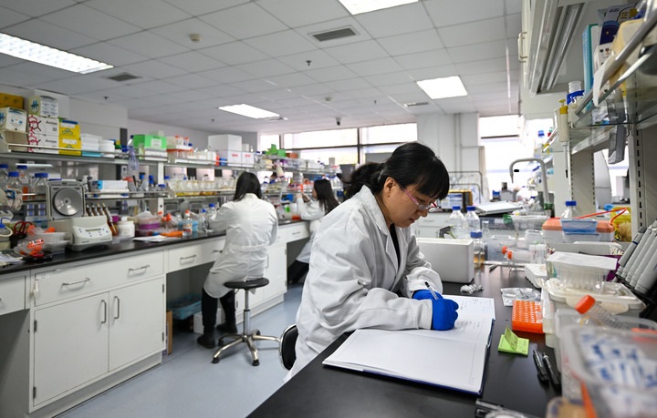 2024年1月2日,在中国科学院天津工业生物技术研究所,科研工作人员记录实验数据。(新华社资料图片)