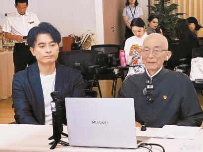 在陈龙(左)的见证下,宣誓仪式在游本昌(右)居住的养老院以远程方式举行。受访者供图