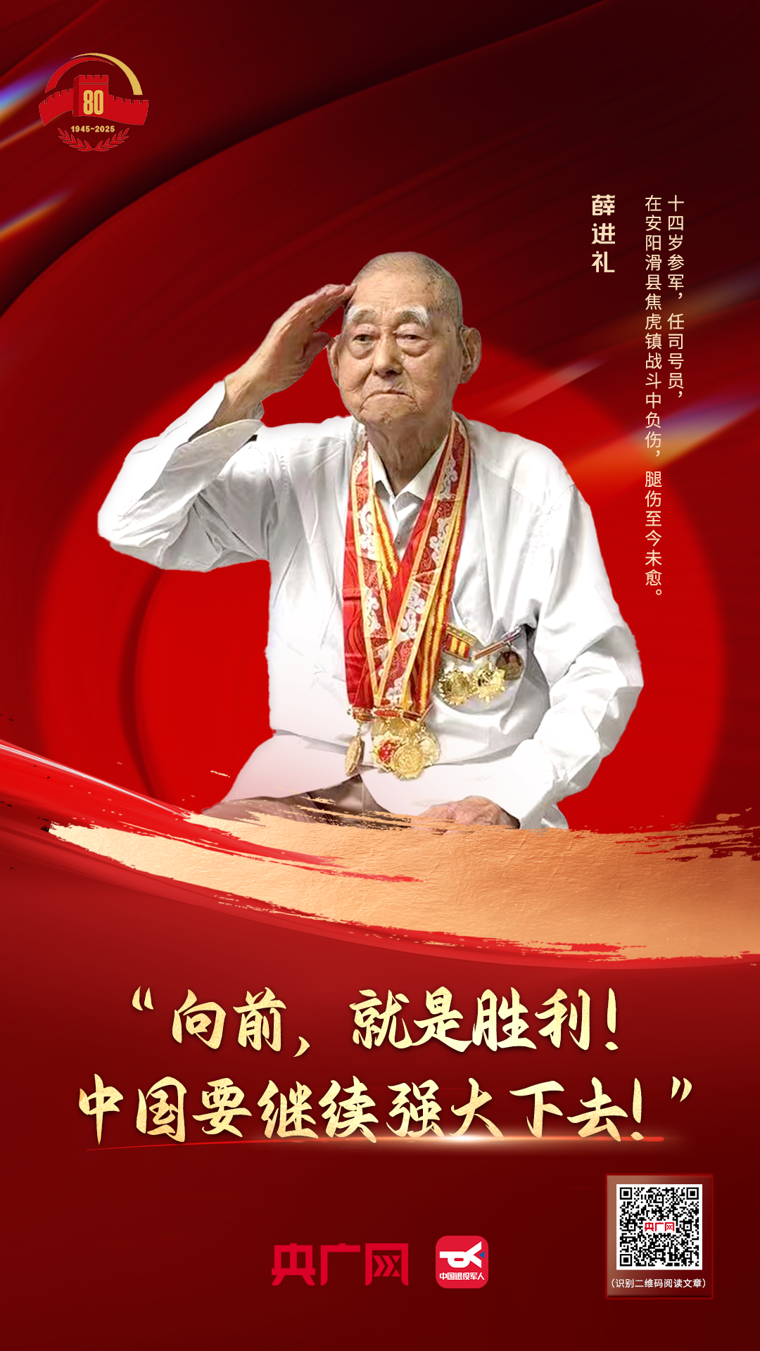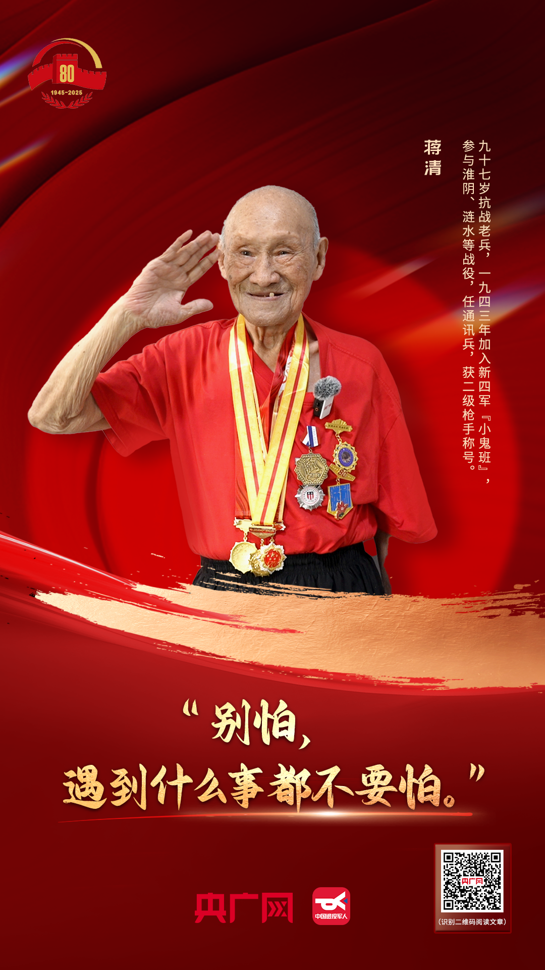 岁月会模糊容颜 但他们用热血写就的史诗永不褪色 永远是照亮我们前行的光 指引着每一代人 铭记历史,奋勇向前! 今天 我们满怀赤诚 向浴血奋战的抗战老兵们 致以最崇高的敬意! 监制:王薇 张琼文 策划:张璐华 记者:王勇生 张丽娜 胡斐 郇康新 设计:刘思岐 特别鸣谢:退役军人事务部宣传中心