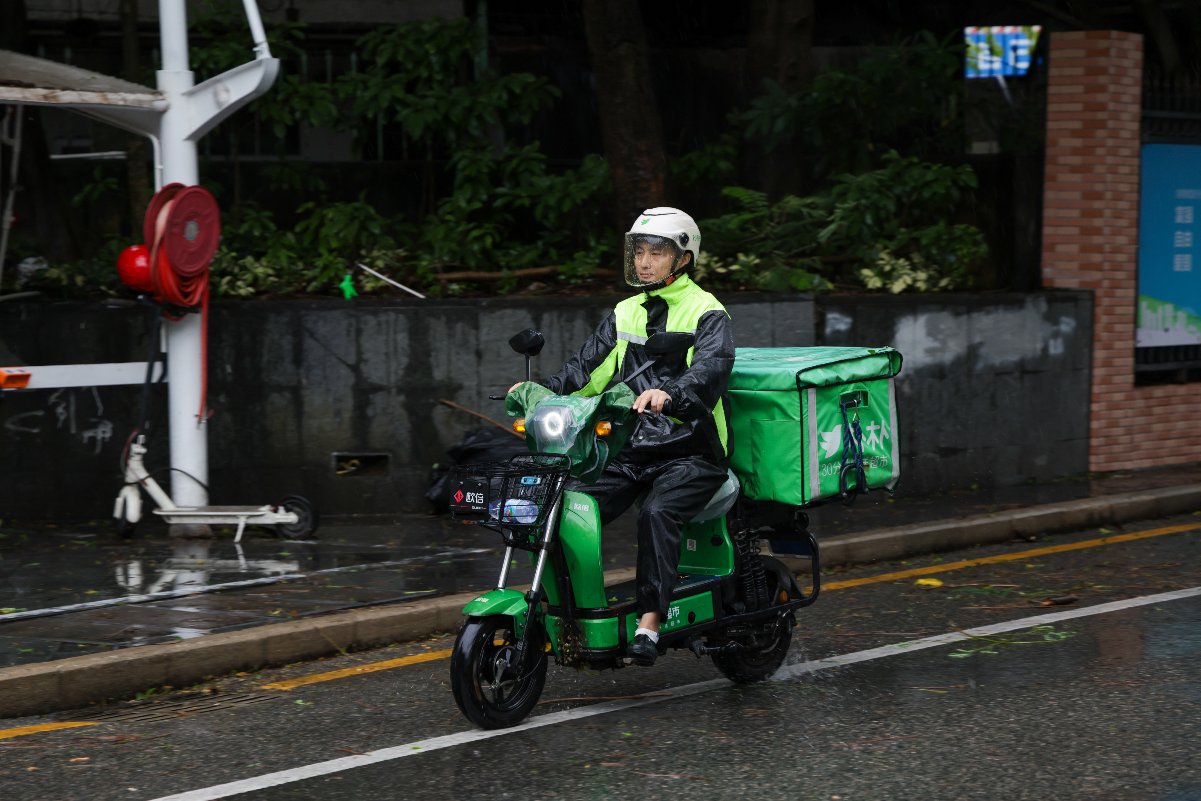 9月24日,一名外卖员驾驶电动自行车行驶在深圳市的路上。(新华社)