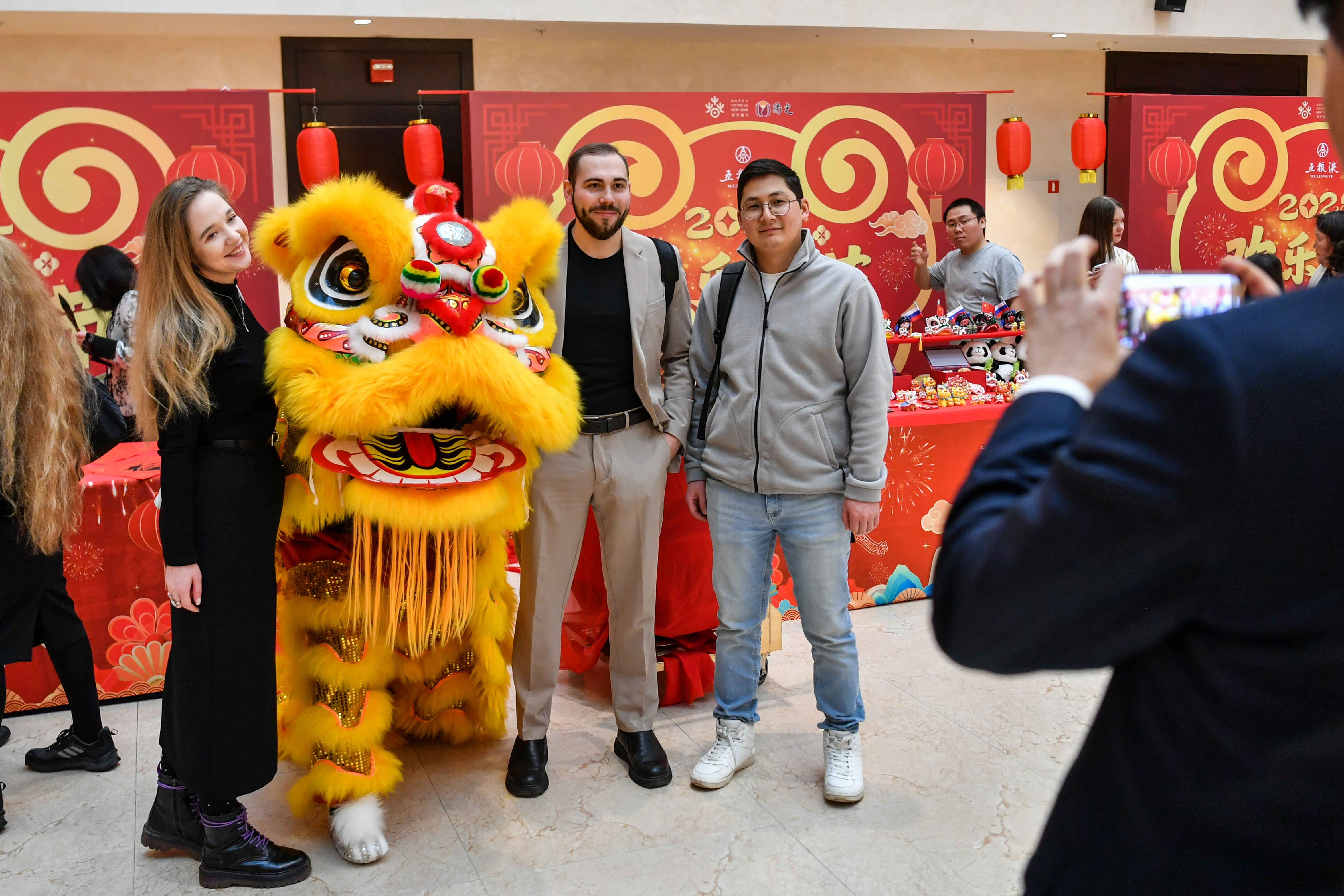 1月28日,在俄罗斯莫斯科举行的新春庙会活动上,人们与舞狮表演者合影。(新华社)