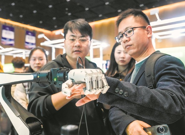 参观者现场体验机械手臂的控制力