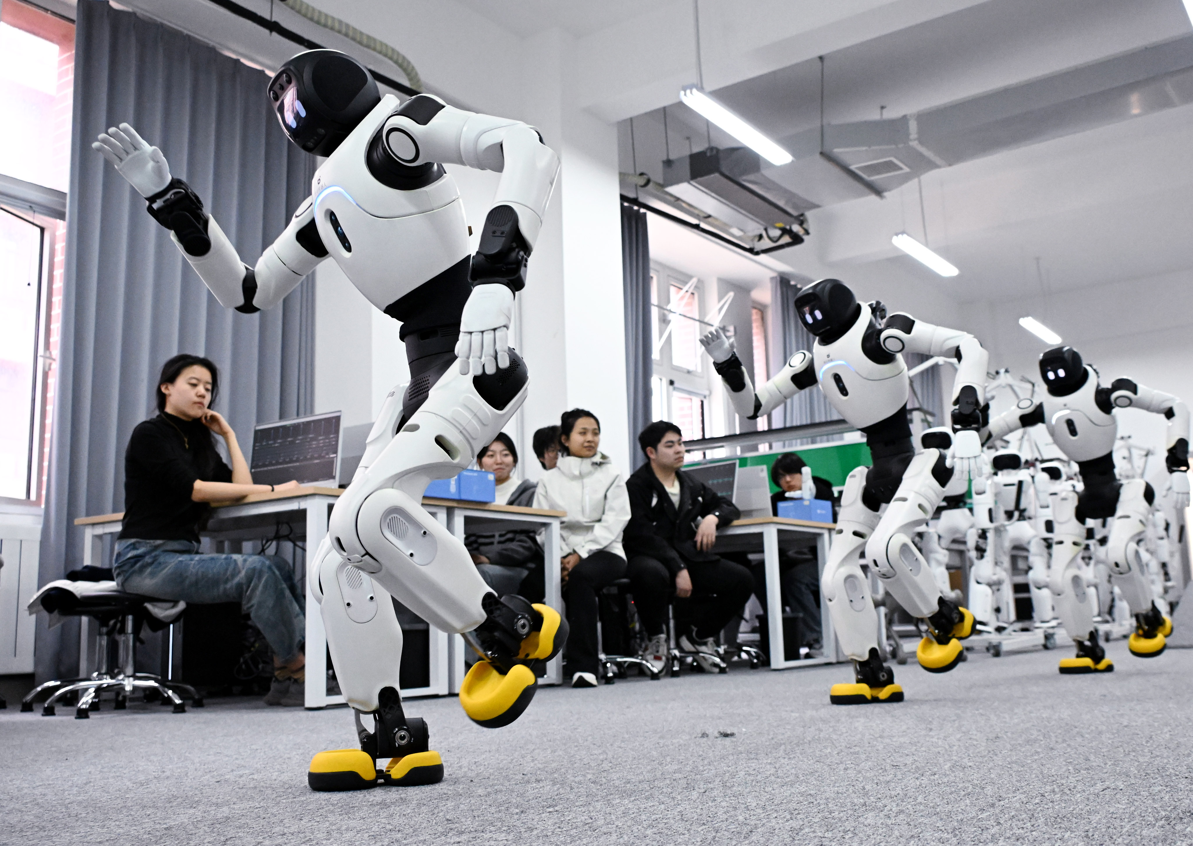 3月26日,在青岛职业技术学院具身智能机器人实训基地,人形机器人在课堂上进行动作编程效果演示。(新华社)