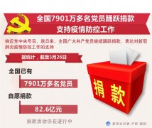 响应党中央号召,连日来,全国广大共产党员继续踊跃捐款,表达对新冠肺炎疫情防控工作的支持。据统计,截至3月26日,全国已有7901万多名党员自愿捐款82.6亿元。捐款活动仍在进行中。 责任编辑:日升...