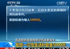 央视截图 据中央电视台新闻频道报道,在纪念中国人民抗日战争暨世界反法西斯战争胜利70周年之际,根据中央要求,民政部财政部日前下发通知,向部分健在的抗战老战士、老同志发放一次性生活补助金5000元。 此次具体发放对象包括: 1、抗日战争时期的在乡复员...