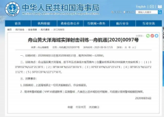8月6日,中国海事局网站发布航行通告,通告称,8月11日至13日,舟山黄大洋海域实弹射击训练;8月16日至17日,舟山海区岱山水道北面海域实弹射击训练。 训练期间,上述海域禁止一切无关船舶航行、作业或锚泊。 【通告全文】 1、舟山黄大洋海域实弹射击训练--...