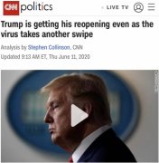 当地时间6月11日,美国有线电视新闻网在报道中写道:目前,美国仍缺少有效的治疗方法和疫苗,新冠病毒也正在加速袭击。在疫情防控、种族斗争等问题还未得到解决时,特朗普就急于重启经济,不禁让人怀疑这究竟是为了美国人的利益还是政治的斗争。 CNN报道,即...