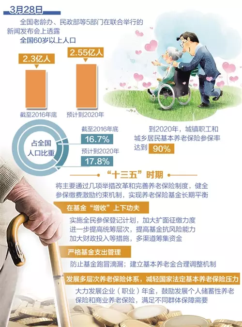 近日,全国老龄办、民政部、国家发改委、人社部、国家卫计委等五部委发布了《“十三五”国家老龄事业发展和养老体系建设规划》。 《规划》立足于我国“未富先老”的现实,提出了4个方面的目标、设置了8个方面的主要任务。 规划目标:到2020年,老龄事业发展整体水平明显提升,养老体系更加健全完善,及时应对、科学应对、综合应对人口老龄化的社会基础更加牢固。 多支柱、全覆盖、更加公平、更可持续的社会保障体系更加完善。 居家为基础、社区为依托、机构为补充、医养相结合的养老服务体系更加健全。 有利于政府和市场作用充分发挥的制度体系更加完备。 支持老龄事业发展和养老体系建设的社会环境更加友好。 主要任务: 1、健全完善社会保障体系 社会保险制度:完善养老保险制度,健全医疗保险制度,探索建立长期护理保险制度。 社会福利制度:着力保障特殊困难老年人的养老服务需求,确保人人能够享有基本养老服务。 社会救助制度:确保所有符合条件的老年人按规定纳入最低生活保障、特困人员救助供养等社会救助制度保障范围。完善医疗救助制度、临时救助制度。 公益慈善事业:鼓励面向老年人开展募捐捐赠、志愿服务、慈善信托、安全知识教育、急救技能培训、突发事故防范等形式多样的公益慈善活动。 2、健全养老服务体系 夯实居家社区养老服务基础:大力发展居家社区养老服务。加强社区养老服务设施建设。 居家社区养老服务工程 依托城乡社区公共服务综合信息平台,以失能、独居、空巢老年人为重点,整合建立居家社区养老服务信息平台、呼叫服务系统和应急救援服务机制,方便养老服务机构和组织向居家老年人提供助餐、助洁、助行、助浴、助医、日间照料等服务。 实施“互联网+”养老工程。支持社区、养老服务机构、社会组织和企业利用物联网、移动互联网和云计算、大数据等信息技术,开发应用智能终端和居家社区养老服务智慧平台、信息系统、APP应用、微信公众号等,重点拓展远程提醒和控制、自动报警和处置、动态监测和记录等功能,规范数据接口,建设虚拟养老院。 推动养老机构提质增效:加快公办养老机构改革。支持社会力量兴办养老机构。全面提升养老机构服务质量。 加强农村养老服务:推动农村特困人员供养服务机构服务设施和服务质量达标。大力发展农村互助养老服务。发挥农村基层党组织、村委会、老年协会等作用,积极培育为老服务社会组织。 3、健全健康支持体系 推进医养结合:完善医养结合机制。支持养老机构开展医疗服务。 加强老年人健康促进和疾病预防:开展老年人健康教育,促进健康老龄化理念和医疗保健知识宣传普及进社区、进家庭,增强老年人的自我保健意识和能力。 发展老年医疗与康复护理服务:加强老年康复医院、护理院、临终关怀机构和综合医院老年病科建设。有条件的地区可将部分公立医院转为康复、护理等机构。 加强老年体育健身:鼓励发展老年人体育组织,到2020年,90%的街道和乡镇建立老年人基层体育组织,城乡社区普遍建立老年人健身活动站点和体育团队。 4、繁荣老年消费市场 丰富养老服务业态:支持养老服务产业与健康、养生、旅游、文化、健身、休闲等产业融合发展,丰富养老服务产业新模式、新业态。 繁荣老年用品市场:增加老年用品供给。提升老年用品科技含量。 5、推进老年宜居环境建设 推动设施无障碍建设和改造,营造安全绿色便利生活环境。 老年宜居环境建设示范行动 完善老年宜居环境建设评价标准体系,开展“老年友好型城市”和“老年宜居社区”建设示范行动,继续开展全国无障碍建设城市创建工作。到2020年,60%以上城市社区达到老年宜居社区基本条件,40%以上农村具备老年宜居社区基本条件,大部分老年人的基本公共服务需求能够在社区得到满足。 弘扬敬老养老助老的社会风尚:把敬老养老助老纳入社会公德、职业道德、家庭美德、个人品德建设,纳入文明城市、文明村镇、文明单位、文明校园、文明家庭考评。 6、丰富老年人精神文化生活 发展老年教育,繁荣老年文化,加强老年人精神关爱。 老年教育机构基础能力提升计划 改善现有老年大学(学校)办学条件。建设一批在本区域发挥示范作用的乡镇(街道)老年人学习场所。改善基层社区老年教育机构设施设备,建设好村、社区老年学习点。探索“养、医、体、文”等场所与老年人学习场所的结合。开展养教结合试点。编辑出版有时代特色、科学内涵、文化品位,适应社会需要的老年教育系列教材。 7、扩大老年人社会参与 培育积极老龄观:引导老年人树立终身发展理念,始终保持自尊自爱自信自强的精神状态,积极面对老年生活,参与社会发展,发挥正能量,作出新贡献。引导全社会正确认识、积极接纳、大力支持老年人参与社会发展。 加强老年人力资源开发,发展老年志愿服务,引导基层老年社会组织规范发展。 基层老年协会规范化建设工程 多渠道筹措资金支持基层老年协会建设,改善基层老年协会活动设施和条件,加强基层老年协会骨干培训和活动辅导,鼓励专业人士在基层老年协会能力建设中发挥骨干作用。积极推进基层老年协会党建工作,探索发挥基层老年协会在促进当地发展、调解涉老纠纷、开展互助服务、活跃老年人精神文化生活等方面积