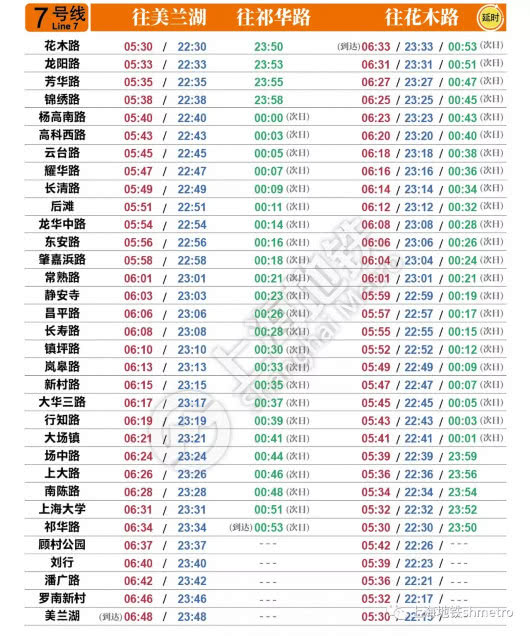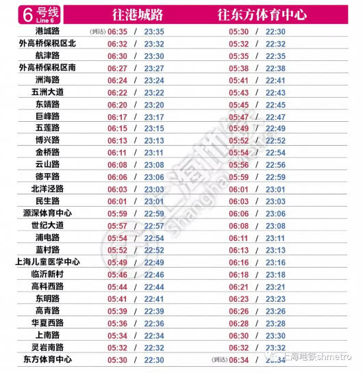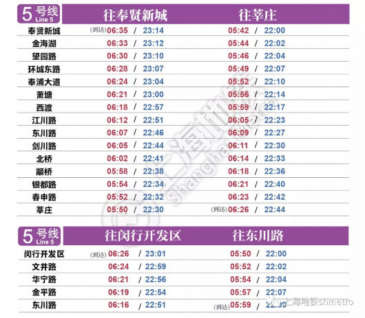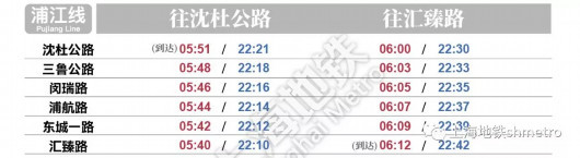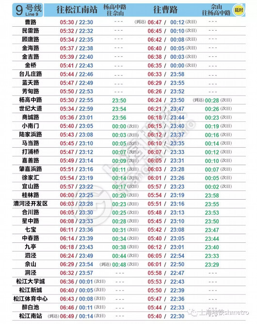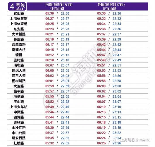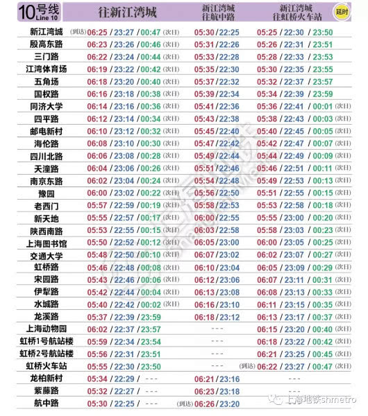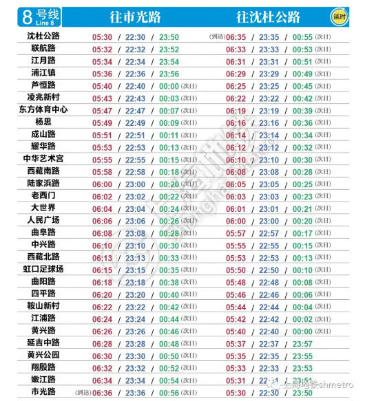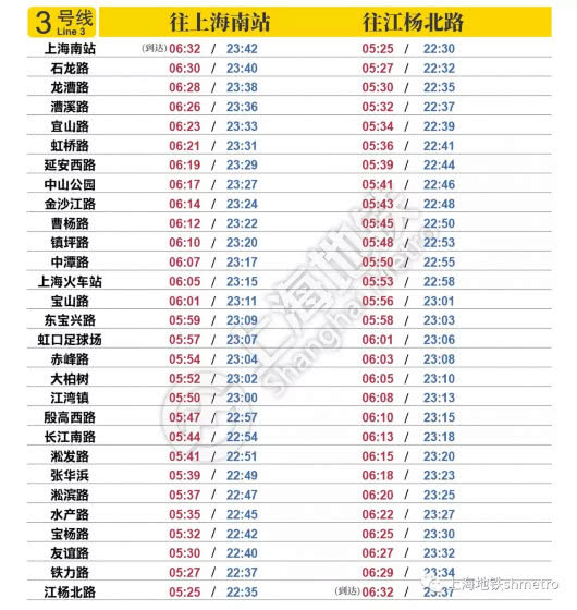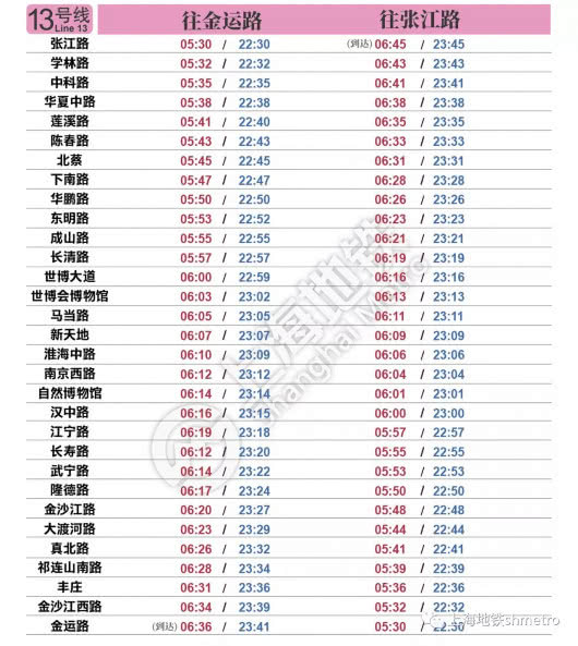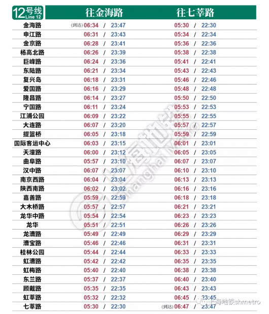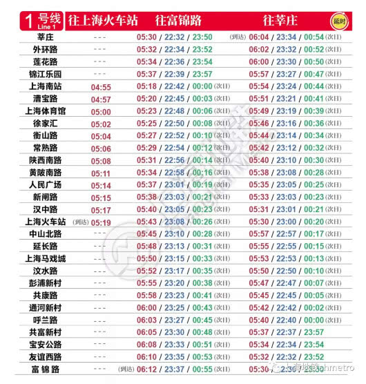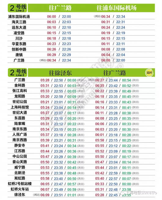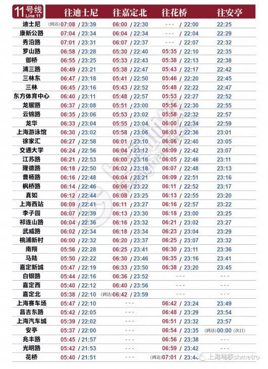 ![]() 注: 1. 1号线每周五、周六延长运营时间。 2.遇国家法定节假日,将另行通知。实际情况以车站现场运营为准。 2号线 ![]() 注: 1. 2号线每周五、周六延长运营时间,不含2号线东延伸段(广兰路站~浦东国际机场站)。 2.遇国家法定节假日,将另行通知。实际情况以车站现场运营为准。 3号线 ![]() 4号线 ![]() 5号线 ![]() 6号线 ![]() 7号线 ![]() 注: 1. 7号线祁华路站至花木路站区段每周五、周六延长运营时间。 2.遇国家法定节假日,将另行通知。实际情况以车站现场运营为准。 8号线 ![]() 注: 1. 8号线每周五、周六延长运营时间。 2.遇国家法定节假日,将另行通知。实际情况以车站现场运营为准。 9号线 ![]() 注: 1. 9号线佘山站至杨高中路站区段每周五、周六延长运营时间。 2.遇国家法定节假日,将另行通知。实际情况以车站现场运营为准。 10号线 ![]() 注: 1. 10号线虹桥火车站站至新江湾城站区段每周五、周六延长运营时间。 2.遇国家法定节假日,将另行通知。实际情况以车站现场运营为准。 11号线 ![]() 12号线 ![]() 13号线 ![]() 16号线 ![]() 17号线 ![]() 浦江线 ![]() (责编:日升) (责任编辑:日升) |