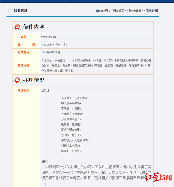 该校网站“院长信箱”栏目截图 夏天来了,为了让学校给宿舍装空调,一些大学生绞尽脑汁。河南一高校学生别出心裁地写了首诗词,投给了学校院长信箱,求装空调,居然得到了校长回复的一首词…… “料得今年夏更长,装空调,李院长!” 学生写《江城子·求装空调》 5月31日,红星新闻记者在河南职业技术学院的网站上“院长信箱”栏目看到一首《江城子·求装空调》格外显眼,而点开这个标题,就能看到校长李桂贞回复的另一首词《江城子·未来可期》。 李桂贞告诉红星新闻记者,她很欣赏学生们这样的表达方式,为了拉近师生距离自己也选择用打油诗的方式回复。李桂贞表示,目前学校已经投入了1000多万资金改造电路,协调电力部门争取配电额,力争明年学生宿舍全部装上空调。 在学校官网的“院长信箱”栏目,红星新闻记者看到,这首5月27日发布的《江城子·求装空调》原文为: “河职靴子耐热强,小风扇,六人房,千亩校园何处可乘凉。莫说心静自然凉,进寝室,桑拿房,辗转反侧梦难香,汗湿裳,床板汤:遥望经贸,唯有泪两行。料得今年夏更长,装空调,李院长!” “料想将来非梦想,同学们,多体谅” 校长神回复:《江城子·未来可期》 5月28日,学生求装空调的词即得到了校长的回复。这首《江城子·未来可期》原文为: “眼见学子受酷热,李院长,心焦慌,为防酷暑多方奔走忙。分说原由话且长。电路老,隐患藏,不堪空调电流量。双回路,增扩容,千万投入,为电有保障。料想将来非梦想,同学们,多体谅。” 在回复的词下面,校方对该校教学、餐厅和宿舍等学习生活区域的空调安装部署和项目施工进展情况进行了详细说明。 校方称,学校各教学楼的教室、餐厅等场所空调的安装工程在2018年初全部实施完毕。学生们尤其关心的公寓安装空调问题,困难主要来自两个方面,一是宿舍线路因逐年老化需重新改造,二是学校用电总负荷急剧增加,剩余总电路容量不能满足学生公寓空调安装后的用电需求。针对这两方面问题,校方已申请对现有供电线路进行扩容,已投入上千万元实施双回路改造项目,近期完成招标工作后将尽快施工。供电问题解决后将优先为学生公寓安装空调,请同学们给予理解与支持。 校长说:感受到了00后的活泼与个性 5月31日,李桂贞告诉红星新闻记者,看到学生的信件,她首先觉得很幽默,对学生们的这种有趣的表达方式很欣赏,实实在在感受到了00后学生们的活泼与个性。 李桂贞称,以打油诗这种形式回复学生们,主要是想让同学们感受到校领导的亲切和平易近人,拉近师生之间的距离。 关于空调安装问题,李桂贞说在线路改造完成后,力争明年学生宿舍全部安装空调。 李桂贞介绍,“我们的信箱是我到学校以后主持开设的,自2017年以来,共收到学校师生和社会公众来信2400余封,来信内容主要涉及服务维修、医疗服务、食堂餐饮、学生管理、校园安全、招生就业、校园网络等方面的问题及建议,多数问题得到了及时高效处理”。 红星新闻记者发现,学生反映的问题还有“洗澡水温度过高”、“图书馆没地方背书”、“茶水房水质”等与学生生活息息相关的问题,多数问题在提问第二天就得到了回复。