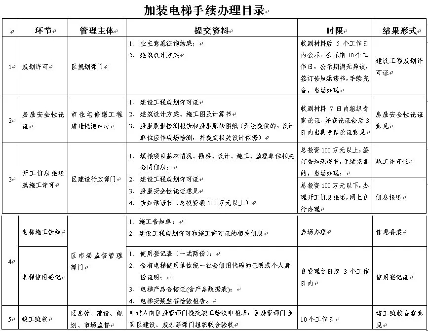 加装电梯工作的若干意见 既有多层住宅加装电梯是改善市民生活、方便老年人出行的重要民生工作。本市自2011年开展试点以来,市区相关部门在指导服务、规范流程、简化审批、质量安全监管、扶持保障措施等方面逐步完善,陆续出台了一系列政策文件,加装电梯数量逐年增加,但与市民的需求相比仍有较大差距。为进一步贯彻落实习近平总书记考察上海时提出的新工作要求,按照十一届市委六次全会形成的《关于深入学习贯彻落实习近平总书记考察上海重要讲话精神奋力谱写新时代上海改革发展新篇章的意见》,重点做好“老小旧远”的相关工作,加快加装电梯速度,在总结试点的基础上,现就做好本市加装电梯工作提出如下意见。 一、总体要求 (一)指导思想。以习近平新时代中国特色社会主义思想为指导,坚持“以人民为中心”的发展理念,进一步完善政策机制,推进基层社会治理创新,加快推动加装电梯工作,更好满足市民群众对美好生活的向往。 (二)基本原则。加装电梯坚持“业主自愿、政府扶持,社区协商、兼顾各方,依法合规、保障安全”的原则。 (三)工作目标。进一步扩大加装电梯试点,完善相关政策,以民生实事来促进业主主体协商、政府扶持引导、各方协同支持、社区组织推进工作机制的建立,做到“能加、愿加则尽加、快加”。 二、推进机制 (一)坚持业主主体。业主是加装电梯的主体。房屋业主或者房屋所属小区业主委员会(未成立业主委员会的由房屋所在地居民委员会指导推举业主代表)是加装电梯的申请人,负责做好加装电梯的业主意愿征询、资金筹措、协议签订、项目申报、工程实施、维护管理等工作。 (二)推动业主协商。在业主自我协商、业委会组织业主协商的基础上,按照《关于加强本市城乡社区协商的实施意见》(沪委办发〔2016〕28号),居民委员会应根据需要,积极搭建社区协商平台,组织业主民主协商,引导各利益相关方理性表达意见诉求,寻求各方意愿的最大公约数,促成共识达成。 (三)政府分级负责。市房屋管理部门负责加装电梯的统筹协调,会同市相关部门做好相关政策制定和实施指导工作;市财政、规划资源、民政、建设、市场监管部门分别负责加装电梯的资金补贴、规划管理、社区协商、质量安全监管、电梯安装和使用监管等方面的指导。市电力、燃气、水务、通信等行业管理部门负责指导相关配套管线单位,做好加装电梯项目的电力扩容、管线移位等相关配套服务工作。 各区政府负责本区加装电梯的组织推进工作,并建立由区领导牵头,区相关部门和街道参加的协调推进工作机制;区房屋、规划资源、建设、市场监管、民政等部门按照职责分工,做好加装电梯项目的指导、审批、监管及社区协商指导等工作。 各街道(镇政府)负责所在街镇加装电梯项目的组织实施和协调工作。 三、项目实施 (一)开展前期评估。对居民提出加装电梯意愿的小区,街道(镇)应当委托建筑设计等专业单位,对小区加装电梯的规划要求、建筑条件、消防安全、小区环境等进行可行性评估,初步明确该小区加装电梯整体设计要求。评估结果应告知所在小区业主委员会,同时告知居民委员会,并抄送区房管、规划资源部门和相关配套管线单位。 (二)业主达成共识。申请人应当依照《物权法》第七十六条规定,就加装电梯的意向和具体方案等问题进行充分协商,并征求所在楼幢全体业主意见,经所在楼幢专有部分占建筑物总面积三分之二以上的业主且占总人数三分之二以上的业主同意。 加装电梯拟占用小区业主共有部分的,应当征求建筑区划内全体业主意见,经建筑区划内专有部分占建筑物总面积过半数的业主且占总人数过半的业主同意,并尽可能优化方案,减少对周边相邻业主的不利影响。加装电梯拟占用业主专有部分的,应当征得专有部分权利人的同意。 业主之间通过协商等方式解决加装电梯中的利益平衡等事宜。 (三)相关费用落实。加装电梯房屋幢业主对加装电梯所需费用、电梯运行维护费用、修理及更新改造费用的筹措、分担及委托电梯管理单位等应达成一致意见,并签订相关协议。 (四)编制设计方案。业主应当依据小区加装电梯整体设计要求,编制加装电梯项目的建筑设计方案和施工图设计文件。电梯选型应当经济合理,同一小区的电梯设备型号、安防系统等优先选择型号一致和匹配的设备,为运行管理和维保提供便利。 (五)公告意愿征询结果及公示方案。业主签订协议后,区房管部门指导业主委员会和居(村)民委员会在小区范围内将业主意愿征询结果进行公告,规划资源部门同时对建筑设计方案进行公示。 (六)办理相关手续。公示结果无异议的,申请人按有关规定向区规划、建设、市场监管部门办理项目规划许可、安全性论证、开工信息报送或施工许可、电梯安装及使用登记、竣工验收手续。 市相关部门应公布办事指南、统一申报材料、规范审批流程。各区应结合实际,按照行政审批制度改革和优化营商环境的要求,优化工作流程,积极推进“一门式”集中受理审批、实施“一网通办”和“只跑一次”审改措施及申报材料互认共享,避免材料重复提供,努力使加装电梯项目审批更简、监管更强、服务更优。 城建档案保管部门及相关单位要为加装电梯调阅档案资料提供便利服务。 四、扶持政策 (一)有关规划
