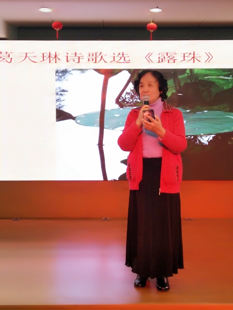 她感谢大家一年来以致多年来对知青文化活动的积极热情参与,对知青诗社工作的支持,对诗集出版的协同配合,也高度评价《秋枫心曲》诗集,是凝聚了十五位作者多年心血和情怀的、沪上不多见的、正能量的、以知青作者为主出版的诗集,作为诗社成立以来的成果之一,值得庆贺。同时她希望大家多多创作好作品,为共和国献上我们这一代人的满腔热忱和晚年余晖。